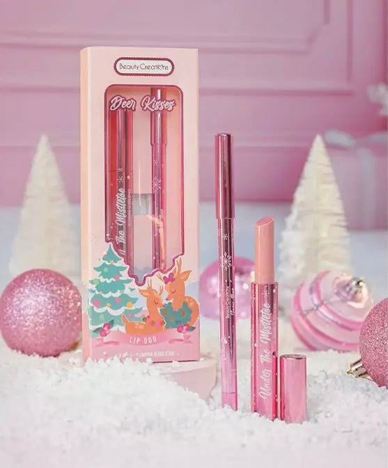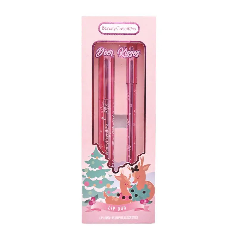 Beauty Creations Deer Kisses Lip Duo. Features Snow Bae a richly pigmented lip liner that glides on effortlessly for precise definition, paired with Under The Mistletoe a high-shine plumping gloss stick that instantly enhances lips for a fuller look. This duo not only adds a touch of glamour but also embodies the festive spirit of the season. 2 pcs in each set.