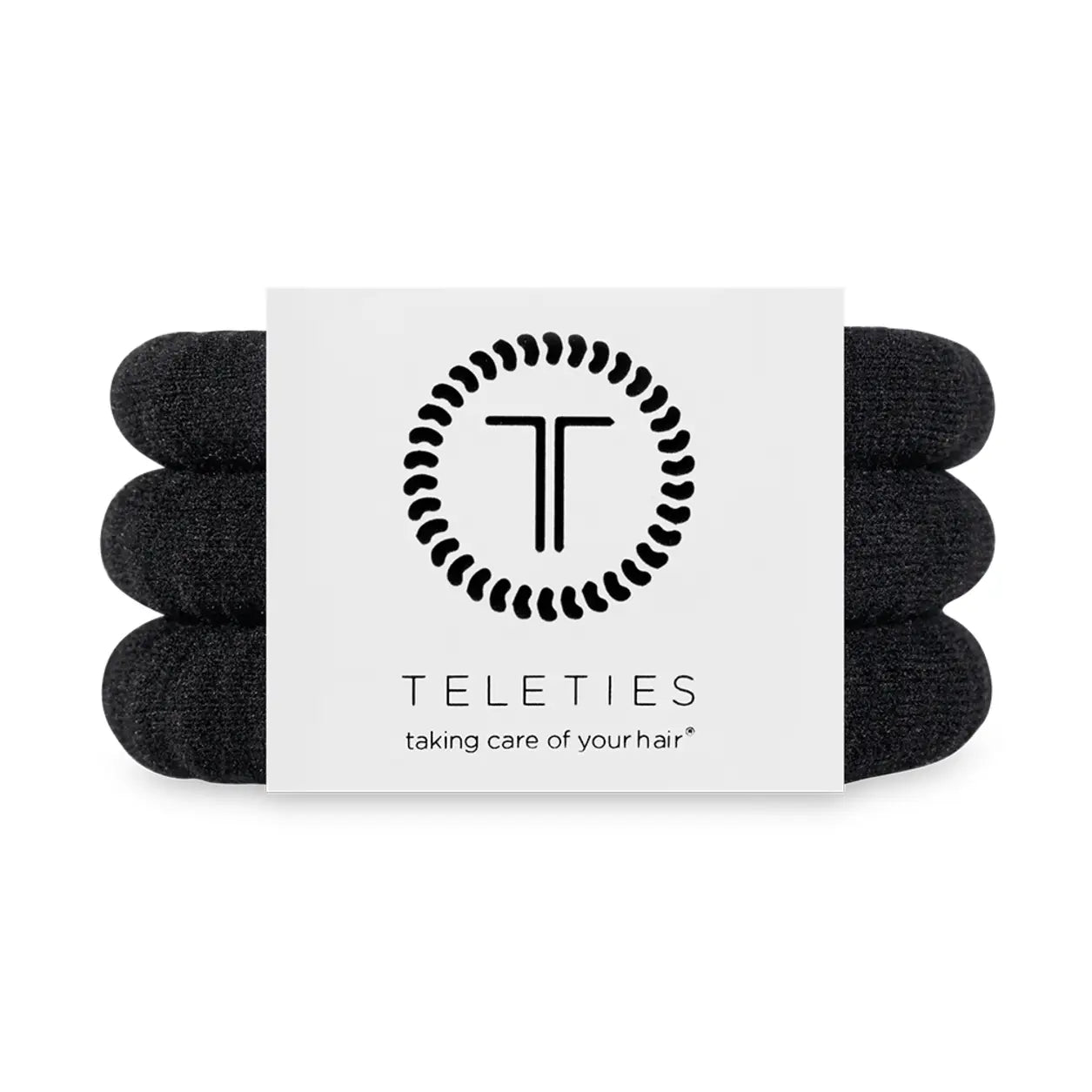 Jet Black Large Nylon Hair Ties are the same game-changing TELETIES coil hair ties, now wrapped in soft nylon for added comfort and curl confidence. These fabric hair ties work great with all hair types, but were made specifically with curly and textured hair in mind. All-day hold on curly, coily, thick, and textured hair Reduces creases & headaches Splash-resistant and dries quickly, perfect for workouts and active lifestyles Moisture-resistant to maintain natural oils Sold in packs of three