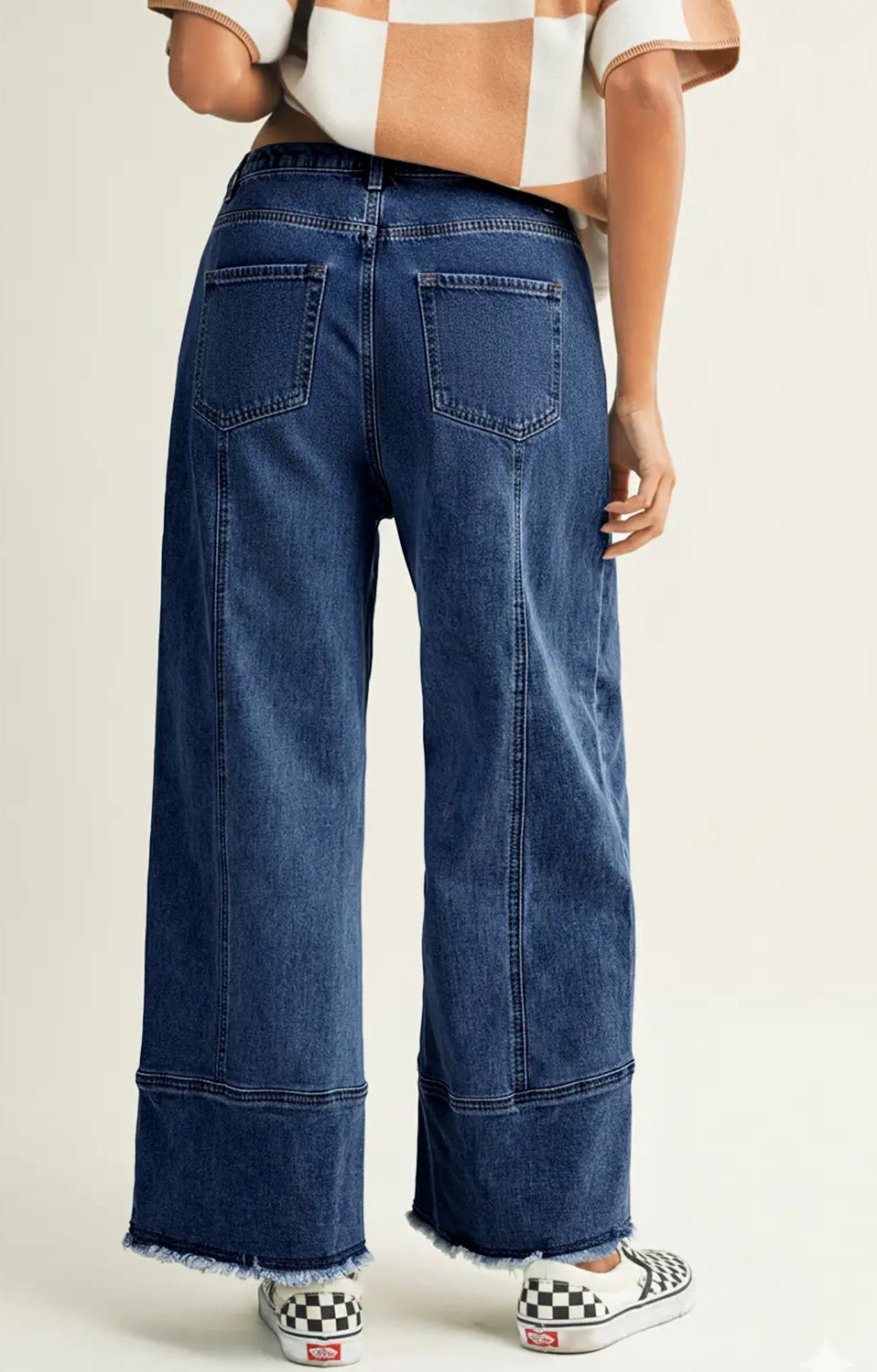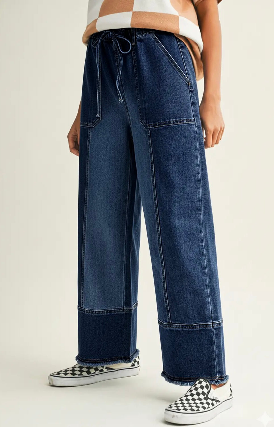 👖 Trendy wide-leg denim pants with a comfy drawstring waist. 🔗 Seam details add unique texture and style. ⬆️ High-waisted wide-leg cut flatters every body type.
